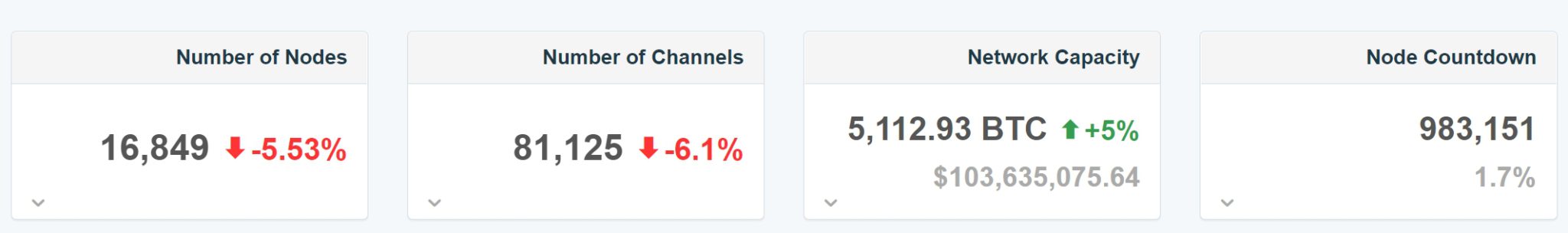 1ML网站统计数据显示,目前比特币闪电网络锁定的比特币数量为5,112.93枚,总价值约为1.03亿美元,过去30天增幅约5%,当前闪电网络节点数量为16849个,过去30天降幅为5.53%,通道数量为81125个,过去30天降幅为6.1%。
