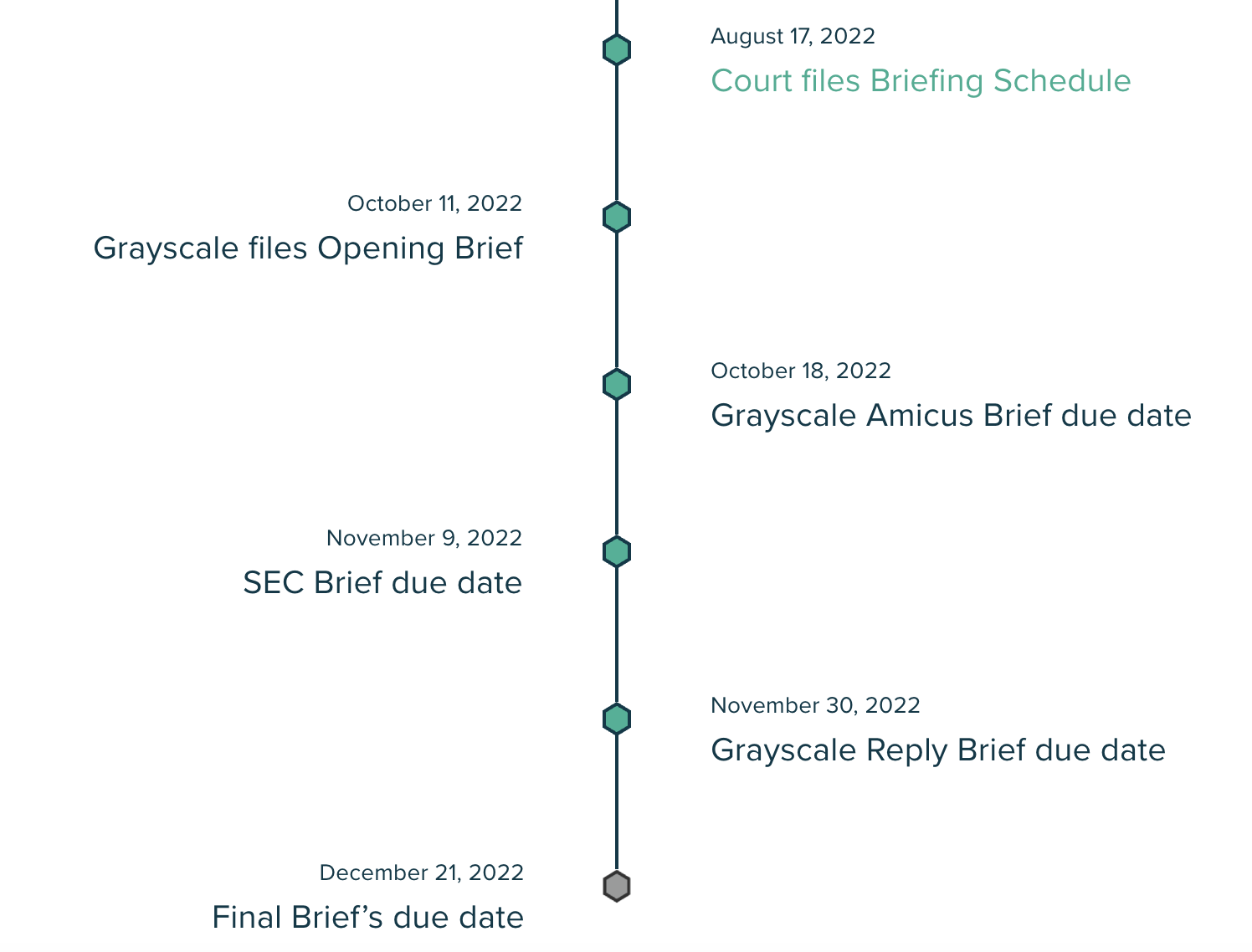 目前按灰度官方网站提供的时程,10月18日截止法庭之友向法院提书,而SEC方面则要11月9日提交文件,而灰度则要在11月30日回复,预计在今年12月结束辩论意见摘要。