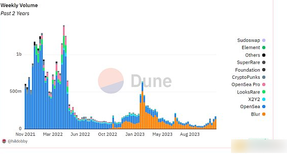 但最终,OpenSea开始直接与竞争对手Blur竞争,这是事情开始出现问题的地方。与这种抢夺交易量的威胁作斗争使得该平台背离了许多最初的以创作者为中心的价值观。Blur一直以来都将自己定位为一个面向"专业交易者"的平台,因此它加大金融化程度、淡化NFT视觉效果并放弃创作者设定的二级版税并不令人意外。