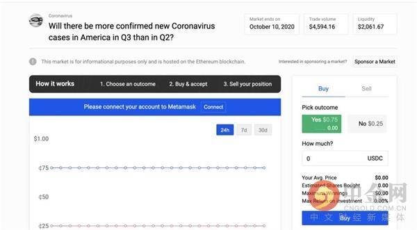 以预测市场「美国第三季度确认的新冠病例会超过第二季度吗?」为例,你可以在到期日之前,通过自己的判定购买该市场的结果下注,选择「会」或「不会」后押注稳定币 USDC 进行购买,之后你就持有该事件结果的股票了。只要未到期,你可以对购买的股票在市场进行交易。