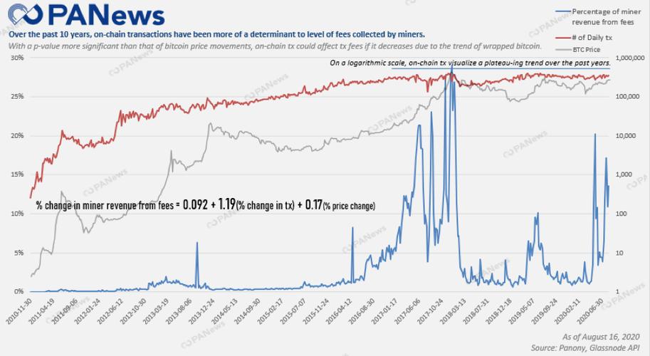 图7 从统计学上来说,链上交易对矿工收入变化百分比的决定性更高,系数为1.19.值得注意的是,在过去的几年中,对数规模上的链上交易一直平稳。