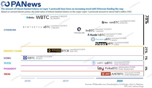 现在,一些Layer1协议中也涌现出不同的比特币支持类代币。例如,智能合约协议Tezos已经宣布了他们自己的原生比特币支持类代币tzBTC,该代币目前正在开发和测试中。在Interlay支持下,Polkadot也宣布了其针对PolkaBTC的开发和测试计划。下图的时间表就列出了在主流Layer1协议上启动或最近宣布的比特币支持类代币,其中大部分都在以太坊上。