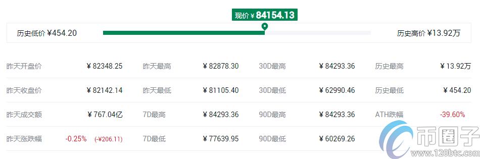 比特币市值2115.68亿美元,流通数量1847.1万,24小时成交额123.9亿美元。