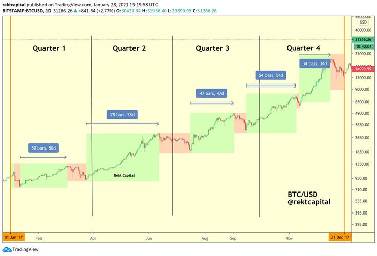 另外在推特上有超过10万粉丝的Rekt Capital也与麦纳德持相反意见,指出:“在2017年,比特币牛市平均花了16天进行修正,但最近的回调仅持续7天。因此,尽管修正期间往往会持续好几周… 在更宽广的整体牛市蓝图中,仍算是非常短。”