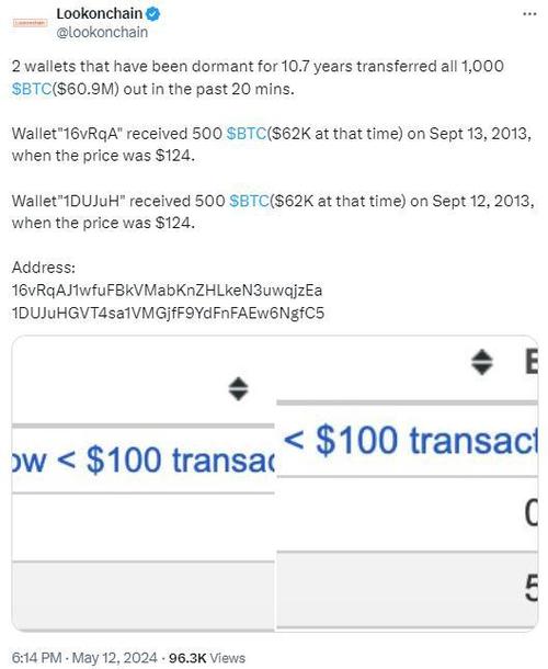 与此同时,区块链追踪网站Whale Alert周五(10)发现,一批休眠7.1年、共握有2,720枚BTC(现值约1.23亿美元)的休眠地址已经复苏,神秘的持有者随后将资金打入两个地址。
