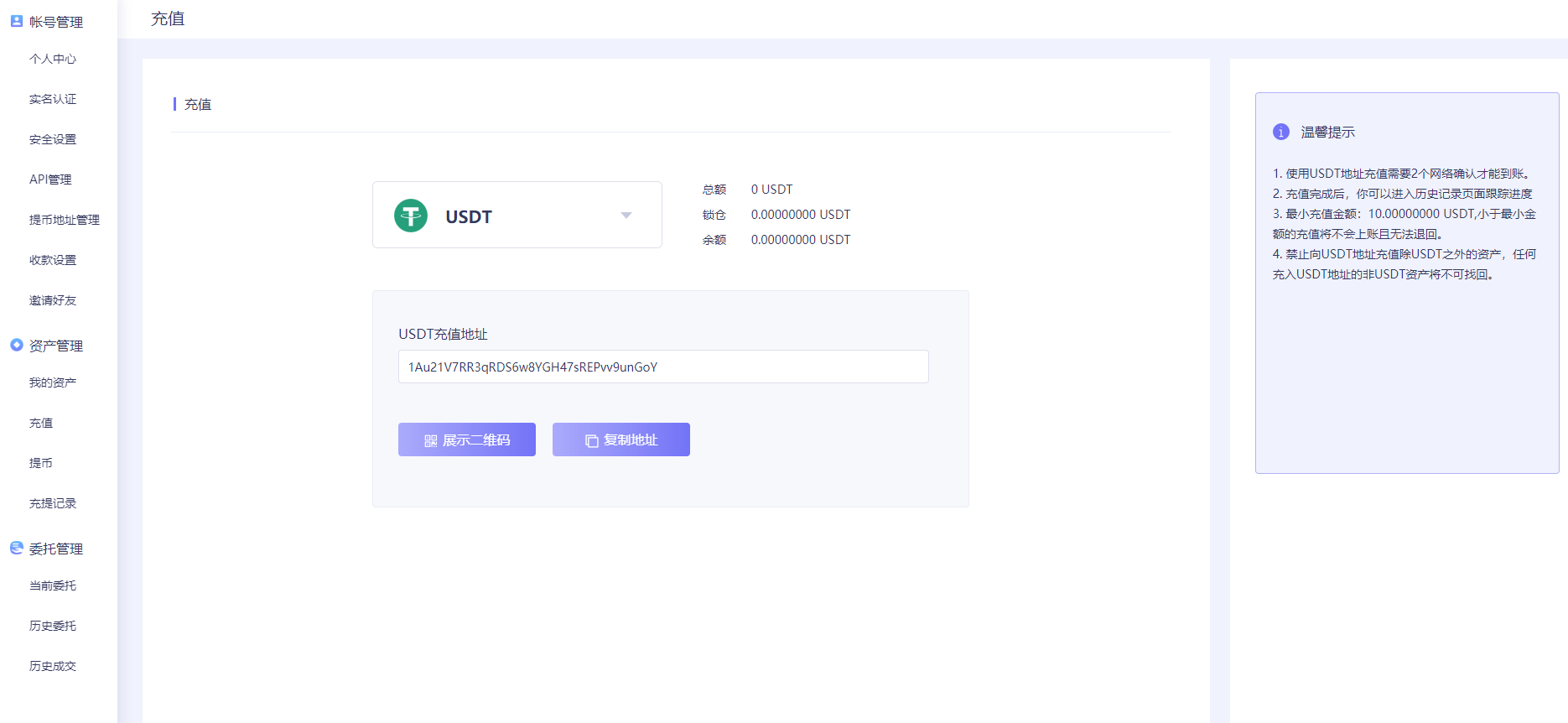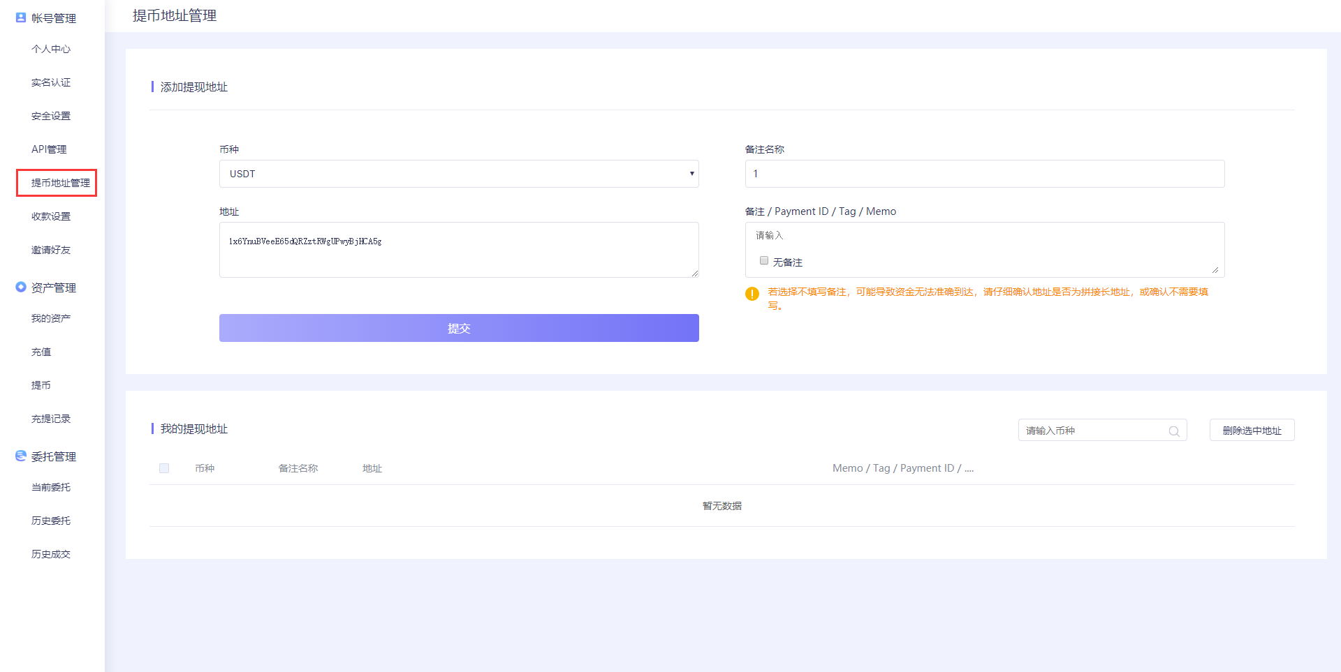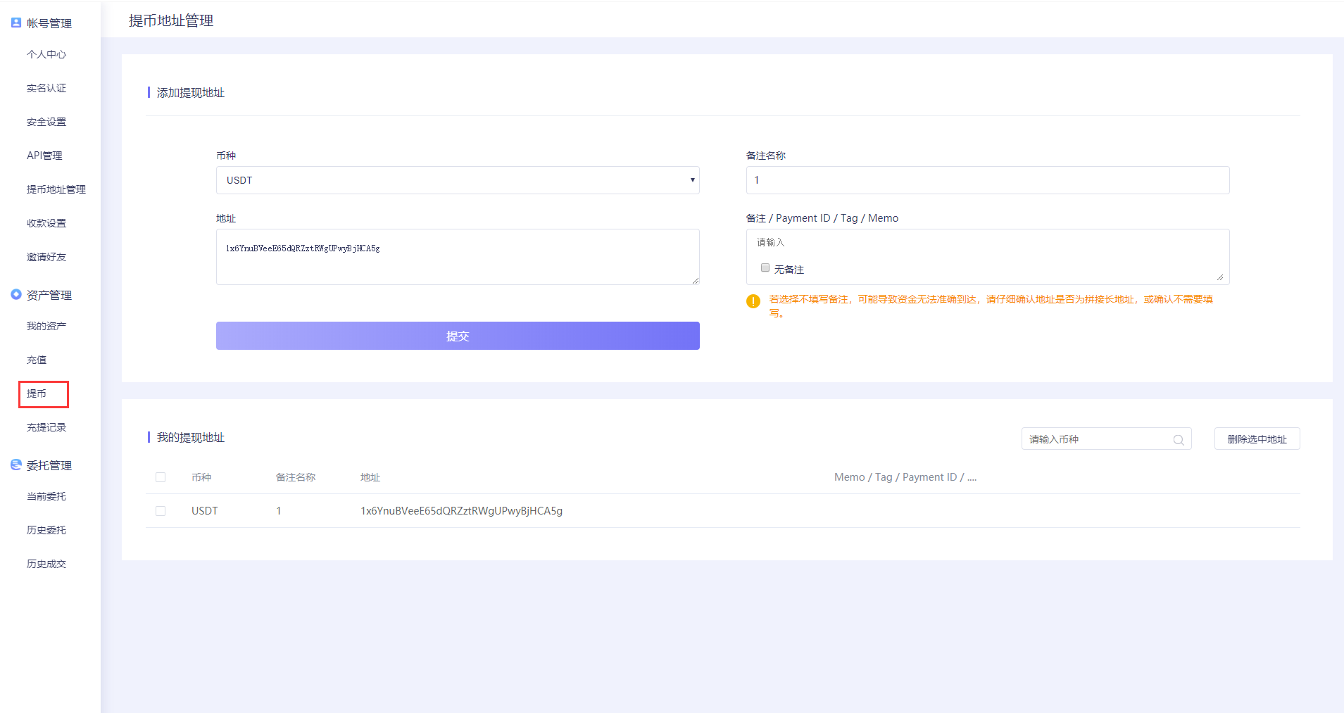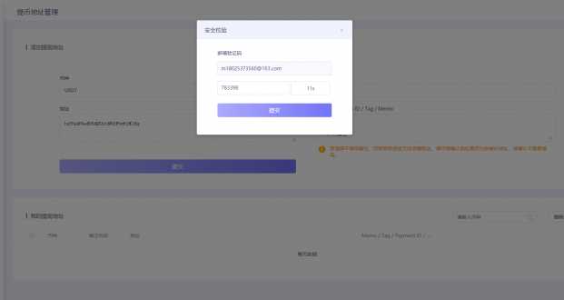 在账号管理中点击提币地址管理进入添加提币地址:这样以USDT为例,输入USDT地址,填写备注名称点击提交,点击获取验证码输入验证码点击提交。