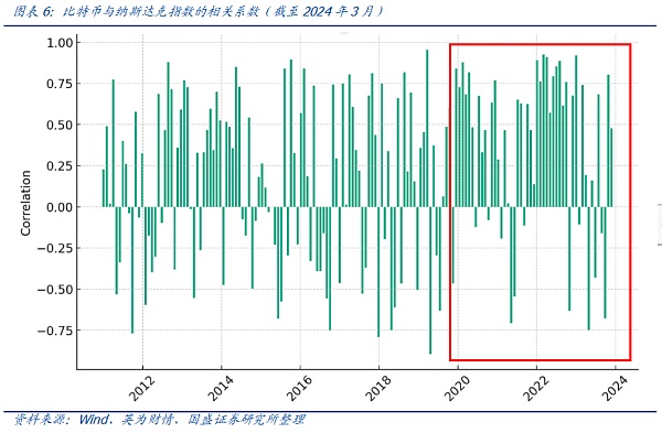 自2010年以来,比特币与纳斯达克指数呈现一定的正相关度,而2020年以后,比特币指数和纳指呈强正相关。2017年比特币登陆美国期货市场,2021年特斯拉购入比特币以及2024年1月美国SEC批准比特币现货ETF,在此背景下,比特币进入美国资本市场后,其表现出与纳指越来越高的正向关联度。可以推测,比特币在美国资本市场资金的认知内,更体现为科技创新属性、高风险属性。