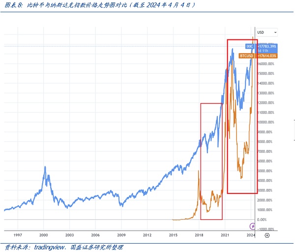 自2010年以来,比特币与纳斯达克指数呈现一定的正相关度,而2020年以后,比特币指数和纳指呈强正相关,体现了科技创新属性。 2017年比特币登陆美国期货市场,2024年1月美国SEC批准比特币现货ETF,在此背景下,比特币进入美国资本市场后,其表现出与纳指越来越高的正向关联度。可以推测,比特币在美国资本市场资金的认知内,更体现为科技创新属性、高风险属性。回到微观层面,将比特币与纳指走势图对比来看,2018至2021年之间,都体现为震荡,而2021年11月中下旬,两者都达到一个历史高点,其后的调整中,两者在2022年10至11月间达到一个调整低点,再之后的走势至今,均创出历史新高。两者表现出越来越高的正相关性。