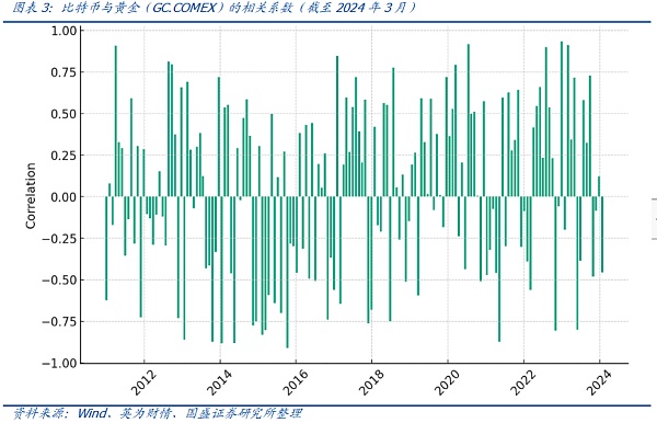 从2010年以来的相关系数来看,比特币价格与黄金价格相关性情况不明朗。 早期,比特币市场不够成熟,其市场表现更多地偏向于高风险、高回报的资产,而市场参与者更多是青睐加密货币的粉丝群体,似乎与传统资本市场投资者(尤其是机构投资者)并无太多关联——与购买黄金的避险者,亦是不同群体。相比之下,传统的黄金市场更多被视为避险资产,投资者更倾向于在经济不确定时购买黄金进行避险、保值。因此,这段时间内比特币价格与黄金价格并无明显相关性亦是反应了市场交易者的预期。随着比特币期货、现货ETF等品种登陆美国登市场,吸引了更多的传统投资者和机构参与交易。那么,是否市场开始将比特币视为一种数字黄金,具有避险和对冲通货膨胀功能的资产?