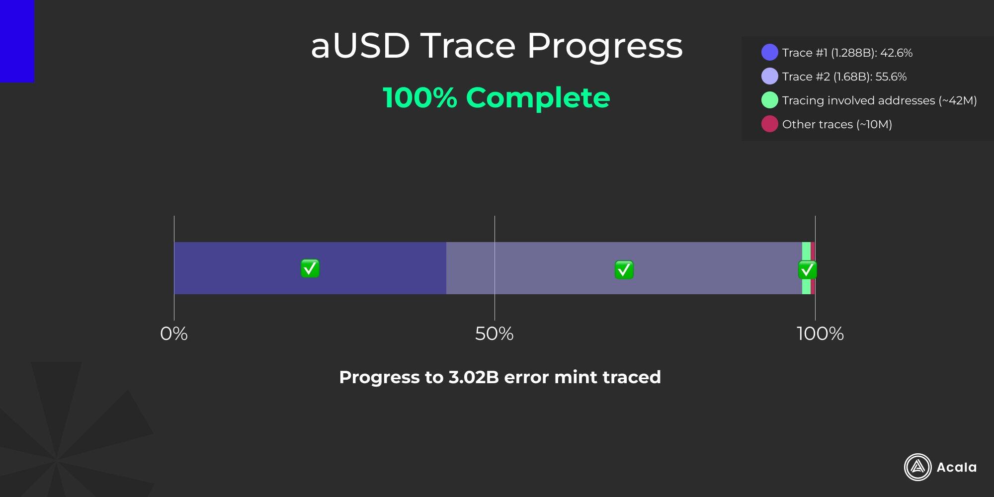 9月5日Acala官方报告称,已完成所有增发aUSD的追踪,目前在剩余5206.8万枚错误铸造的aUSD中已追踪到281个地址。其中83个地址已将增发aUSD转换成其他Token或转移到其他平行链,例如Moonbeam、Astar或CEX。另外,在Acala链上的4248.2万枚增发aUSD中,876.4万枚aUSD保留在各个地址上,其余的则位于DEX模块地址。