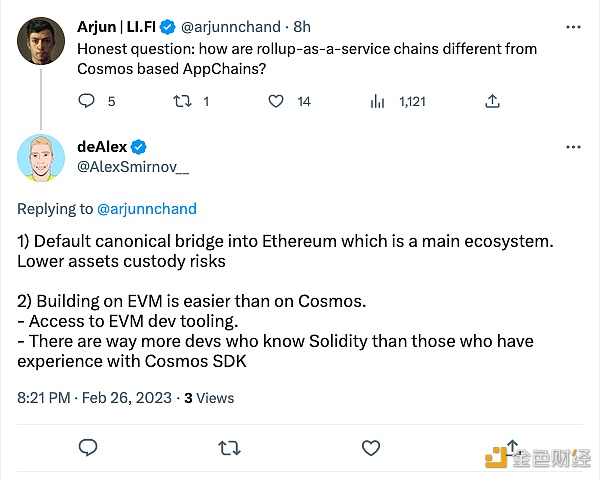 lifi协议在社交媒体上表示,诚实的问题:rollup-as-a-service 链与基于 Cosmos 的应用链有何不同? 对此,跨链桥deBridge联合创始人Alex Smirnov回复称,1.默认的典范桥梁,进入以太坊,这是一个主要的生态系统。资产托管风险较低; 2.在EVM上构建比在Cosmos上更容易。可以使用EVM的开发工具。了解Solidity的开发者比那些有Cosmos SDK经验的开发者多得多。
