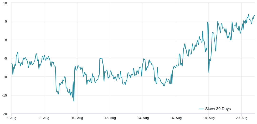 数据显示,在 8 月 15 日崩盘之前,对看涨(买入)BTC 期权的需求过多,该指标为 -11%。这一趋势在接下来的五天内发生了变化,尽管该指标仍处于中性范围内,并且无法突破 7% 的阈值。