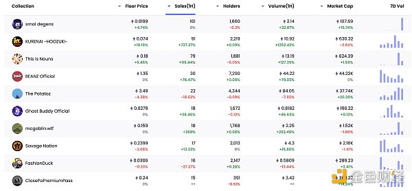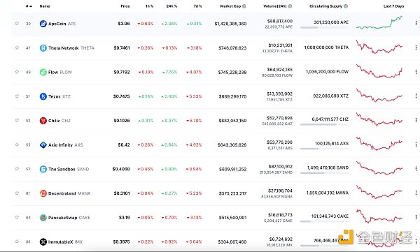 24小时NFT交易量、交易量前十项目 数据来源:Coinmarketcap