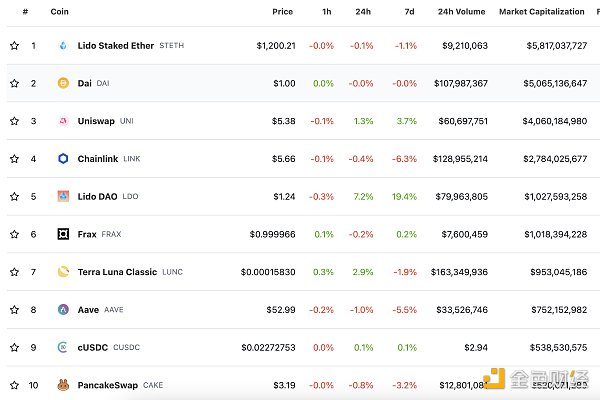 DeFi项目锁定资产前十排名及锁仓量 数据来源:defillama
