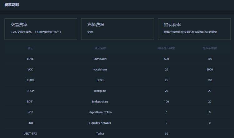 现货交易费率(币币交易):0.2%,杠杆借贷费率:暂时没有,法币交易费率:暂时没有,期货交易费率(合约交易):0.03% – 0.075%。