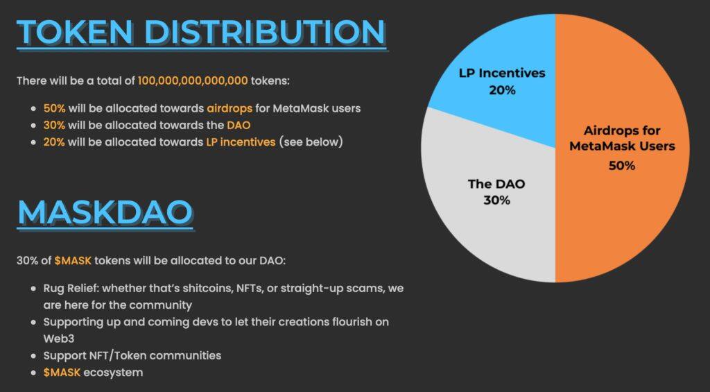 由于此前有消息指出热门的去中心化钱包MetaMask有发行代币的预期,加上最近OpenDAO的SOS代币空投热潮持续延烧。昨(28)日就有一个名为MaskDAO的项目表示,将向社群的MetaMask用户空投代币MASK,以用来奖励以太坊区块链成员进行发送和接收ETH、在DApp上交易、买卖NFT…等行为。