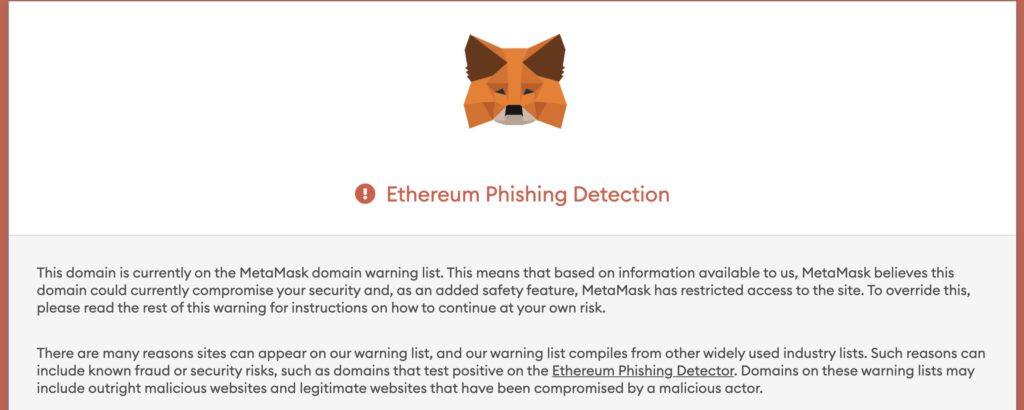 Metamask认为该网站目前可能会危及用户的安全,因此已限制对该网站的访问。警告用户说如果要继续浏览,风险自负。