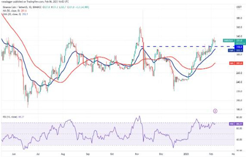 买家推动了BNB的$326价格高于335月50日的5.318美元阻力位。但烛台上的长灯芯表明空头正在更高的水平上卖出。价格回落至6美元的突破水平,烛台的长尾可以看出,多头正在积极买入。