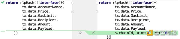 因此,简单来说,在交易签名时,需要提供一个签名器(Signer)和私钥(PrivateKey)。需要Singer是因为在 EIP-155 修复简单重复攻击漏洞后,需要保持旧区块链的签名方式不变,但又需要提供新版本的签名方式。因此通过接口实现新旧签名方式,根据区块高度创建不同的签名器。而 EIP-155 中实现的新哈希算法,主要目的是获取交易用于签名的哈希值 TxSignHash。和旧方式相比,哈希计算中混入了链ID和两个空值。注意这个哈希值 TxSignHash 在EIP155中并不等同于交易哈希值。
