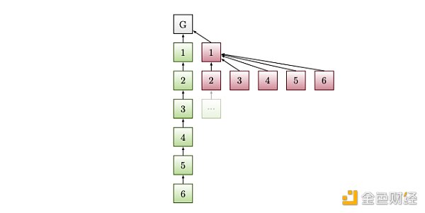 具体如下图所示,由于GHOST分叉选择算法的特性,此时敌对区块n和其后的所有5个分叉和原链中6个区块累加的权重相等,这意味着系统中第7个区块有一定概率会选择连接在攻击者制造的分叉后。在这种情况下,攻击者可以对剩余的扣留区块重复此操作,阻止诚实的验证者继续跟随在证实主链后,直至攻击者用尽所有预留区块。如果攻击者在攻击过程中有更多机会提出区块,他们可以使用这些区块来扩展攻击,这样,越多的验证者参与共谋攻击,攻击持续的时间就越长,并且可以将更多诚实的区块从主链中移出。