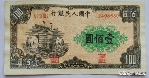 第一套流通纸币一百元面值的版别分别有:1948版耕地与工厂、工厂与火车、蓝色万寿山,1949版红色万寿山、北海桥(有蓝色和红色区别)、轮船、驮运、帆船等2种年号10个左右版别。