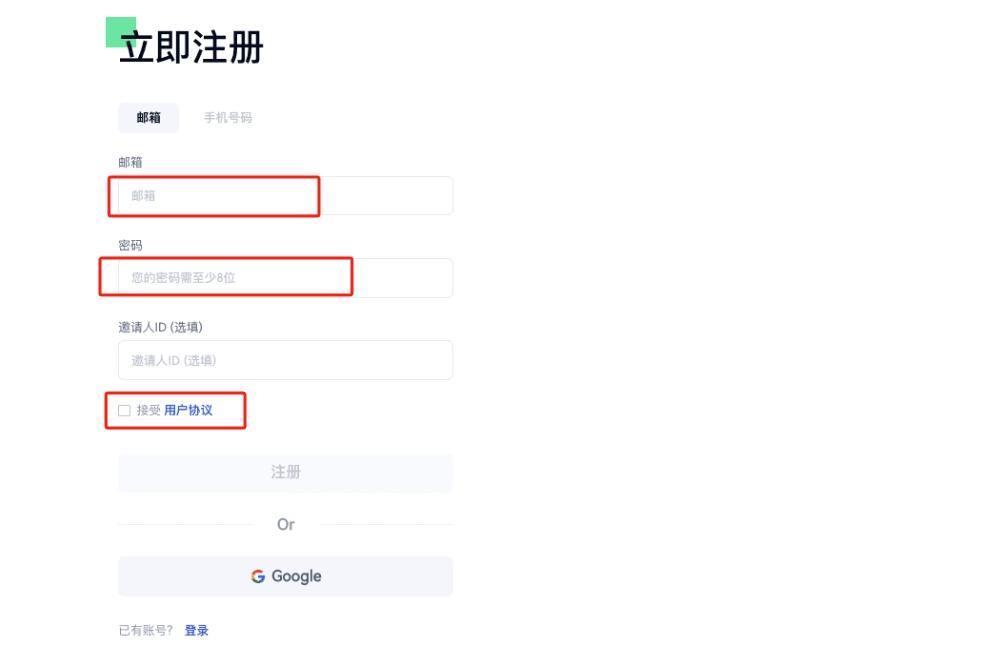 2、在注册页面,根据提示填写信息(邮箱、登录密码等),勾选“接受用户协议”,点击“注册”。