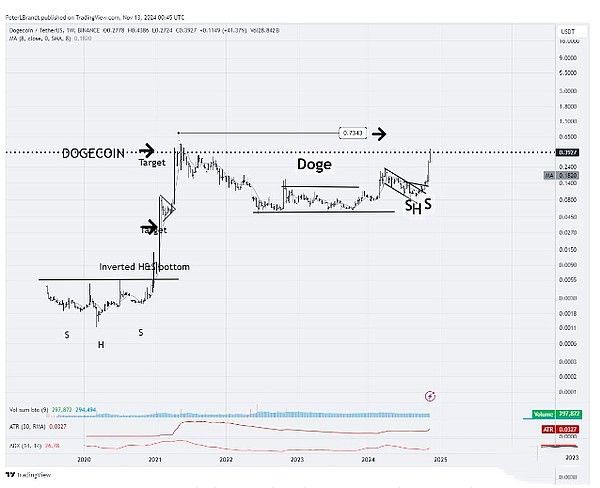 Brandt 解释说,狗狗币在 2020 年也表现出类似的横向积累区间,然后形成了倒头肩 (H&S) 形态。2024 年,狗狗币的周线图也遵循了同样的路径,并且从当前的倒 H&S 形态中突破看涨趋势,导致其价格上涨了 190%。