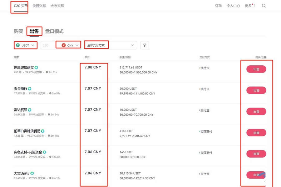 6、选择【出售】,选择【USDT】,选择【CNY】,选择【支付方式】,选择合适的买家进行出售,就完成人民币兑换