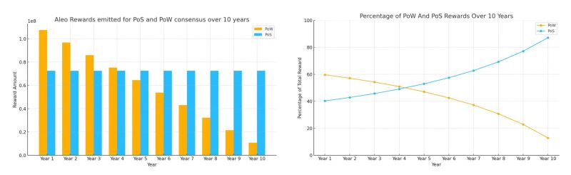 下图展示了未来10年 Aleo 积分通过 PoS 和 PoW共识释放的数量变化和比例关系: