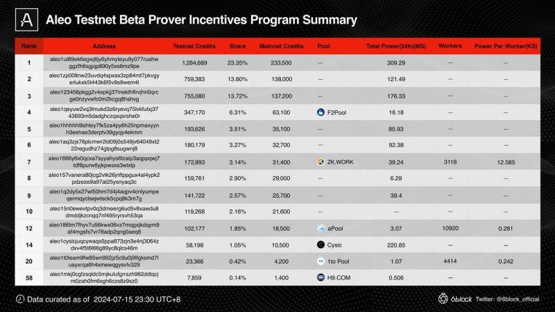 以下是我们总结 Beta 测试网期间获得 Top 10 积分的 Aleo 地址与其部分地址对应的矿池数据对比:
