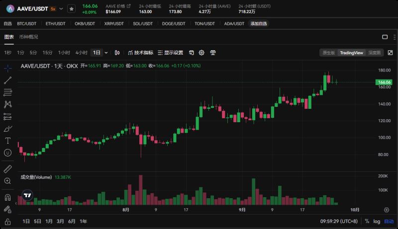 Aave(AAVE)币价翻倍,市场前景如何?重新解析率先复苏的老牌龙头Aave!借贷龙头 Aave(AAVE)在过去几个月内走出了独立于板块弱势表现的逆向行情,在一众老牌 DeFi 协议的代币持续 趴窝”之时,AAVE 的价格却已悄然实现了翻倍 —— 从 8 月 5 日的 80 美元左右强势上涨至如今的 170 美元上方。
