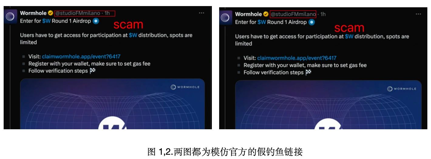 项目Wormhole发布空投 公告时,许多推特模仿官方账户发布假空投链接。图1项目方名称为@studioFMmilano·1h,图2假冒项目方为@studioFMmilano,而真正的项目方为@wormhole。