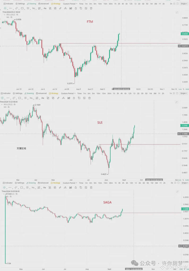 L1赛道的 $SUI 、 $SAGA 、 $FTM 都已经突破了底部震荡区间,开始强势上涨。在美联储降息周期启动,9月降息50个基点后,加密市场宏观不确定性因素减少,流动性也会迎来改善,市场情绪开始转向积极。L1赛道率先启动上涨行情后,预计其他赛道会逐步跟进。