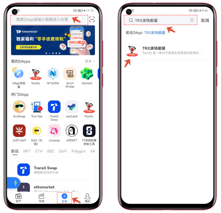 方式一:先点击屏幕下方的【发现】,在搜索拦输入【TRX波场能量】。