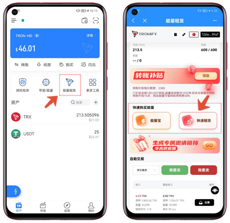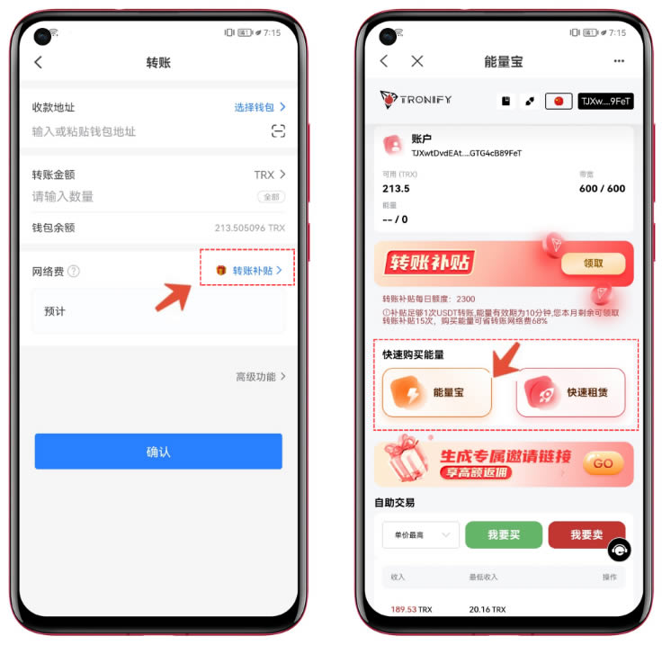 通过【能量宝】或者【快速租赁】以租赁能量覆盖一次转账为例: