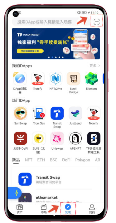 方式二:先点击屏幕下方的【发现】,再点击屏幕右上方的扫描二维码的功能, 扫描下图的TRX波场能量的二维码,即可体验租赁服务降低手续费转账。