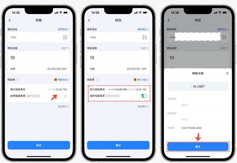 第二步:在【使用能量租赁】,向右滑动按钮,成功打开之后,点击【确认】即可转账。