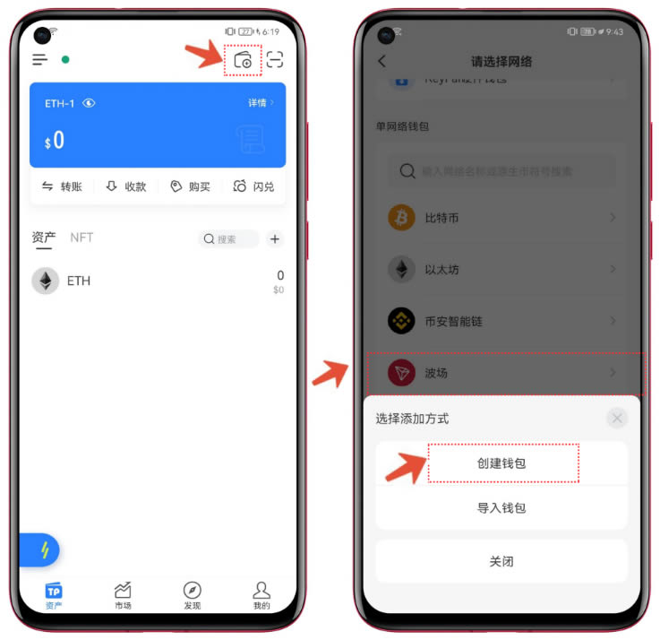 打开TokenPocket点击屏幕右上角的【钱包】,在列表中选择【波场】钱包并创建钱包;如果您已拥有波场钱包,请点击【导入钱包】。