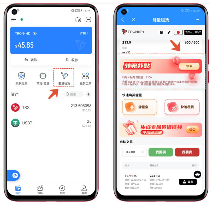 2)A. 安卓版:点击【能量租赁】领取转账补贴。
