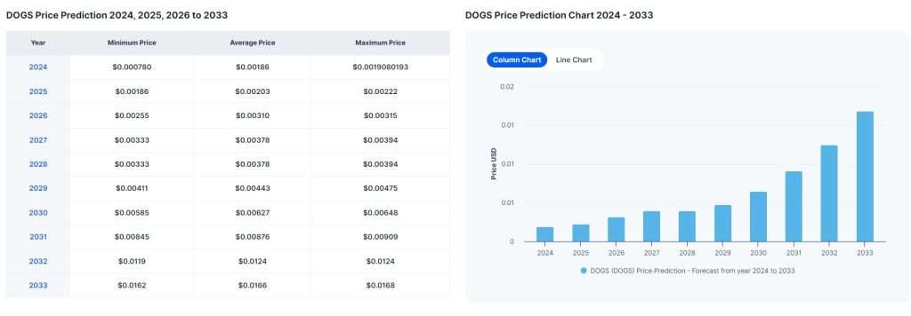 DigitalCoinPrice 预测$DOGS 将在2024 年底达到最高$0.0019,并在第二年突破0.02 美元。最终到2033 年,DOGS 币将达到0.166 美元的平均水平。