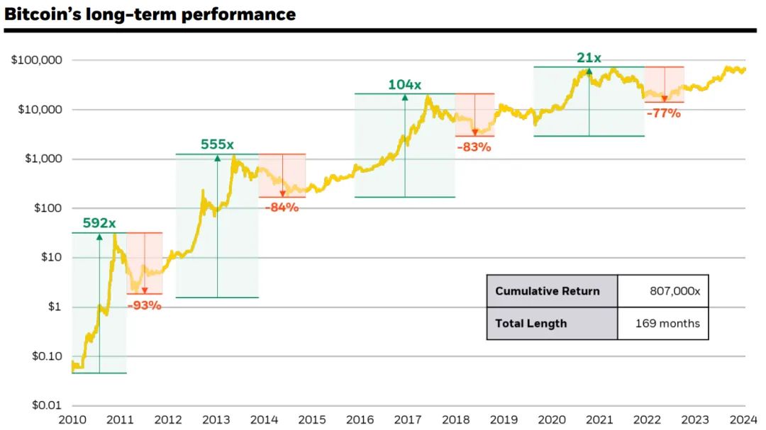 在过去的10年中,比特币有7年的表现超过了所有主要资产类别,年化回报率超过100%。即便如此,比特币在其他3年里却是表现最差的资产,并且出现了四次超过50%的大幅回撤。然而,经过这些历史周期的考验,比特币展现了从大幅回撤中恢复并创下新高的能力,尽管这些周期往往伴随着长时间的熊市。