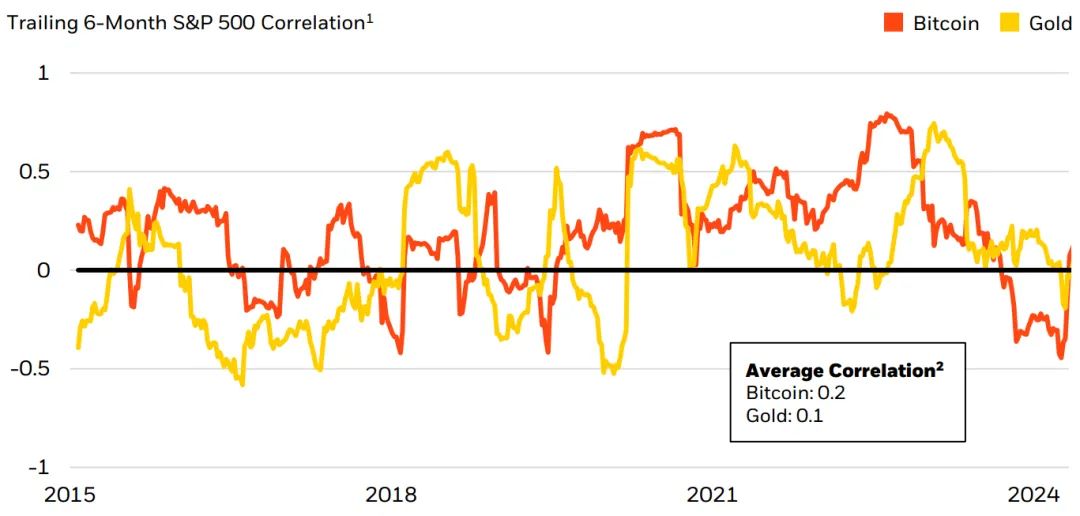 A、比特币与黄金每周回报率与标普500指数的6个月滞后相关性,数据覆盖时间为2015年1月1日至2024年7月31日。来源:彭博比特币现货价格、彭博黄金现货价格、标准普尔全球及贝莱德计算,截至2024年7月31日。