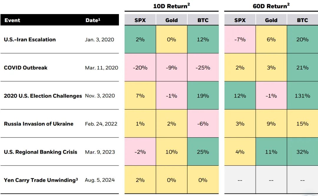 2)S&P 500、黄金和比特币在重大地缘政治事件中的表现