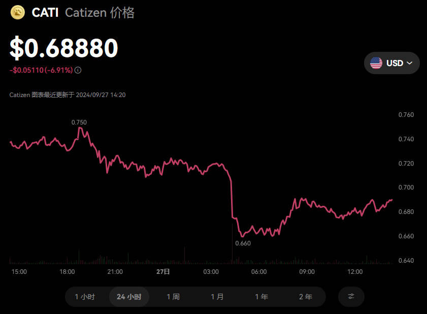 截止目前,CATI 币的交易价格为$ 0.6888,该加密货币在过去24 小时的价格变化为-6.91% ,交易量达到$ 635.5M。