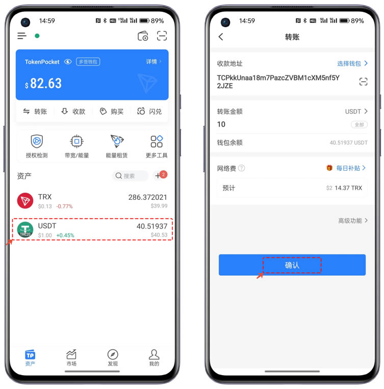 1、打开创建的波场多签钱包,选择需要转账的代币,设置转账参数后,点击【确认】。