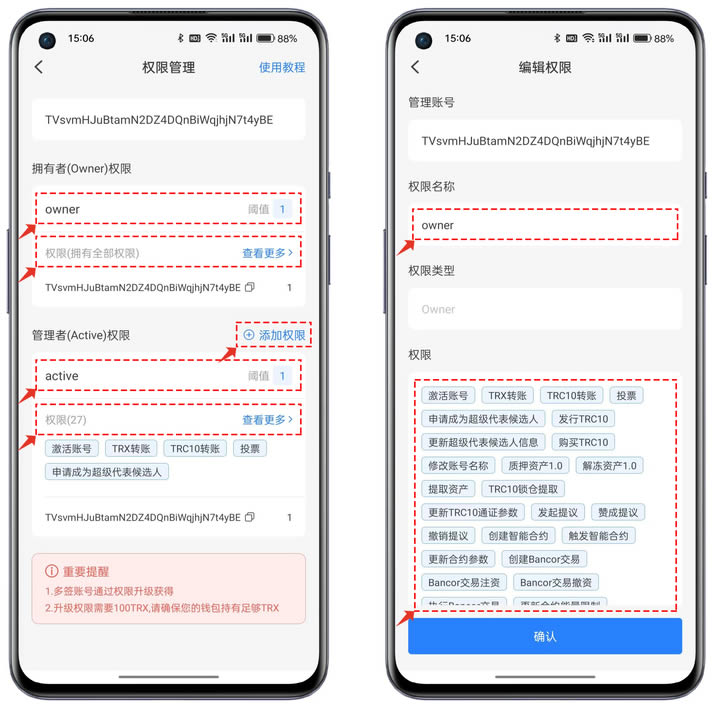 新手稳妥起见权限变更按照先active后owner的顺序,当然这会消耗两次的trx;