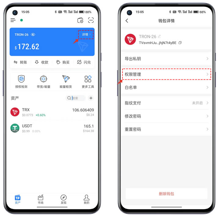 1、打开TokenPocket,点击蓝色区域右上角【详情】,打开【权限管理】菜单。