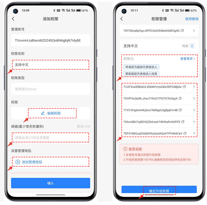 阈值、管理地址、权重要认真检查合理设置,一旦完成上链后是不可逆的操作;