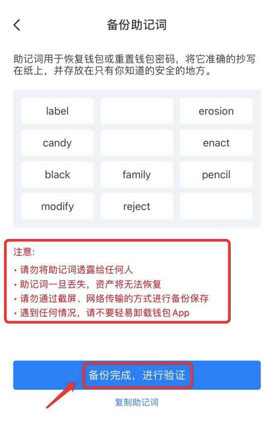 7、进入备份助记词页面后,请勿截图助记词,备份后点击【备份完成,进行验证】;