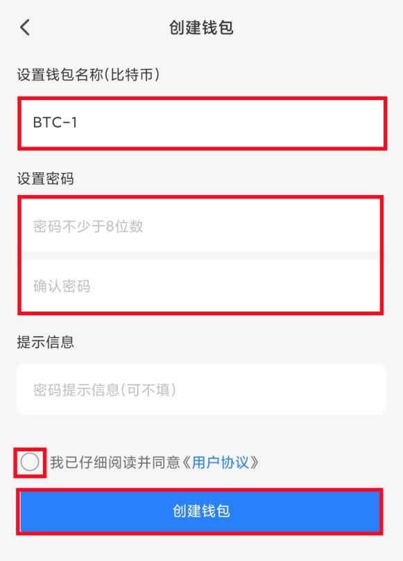 6、依次设置【钱包名】和【密码】,然后勾选【服务及隐私条款】,点击【创建钱包】;